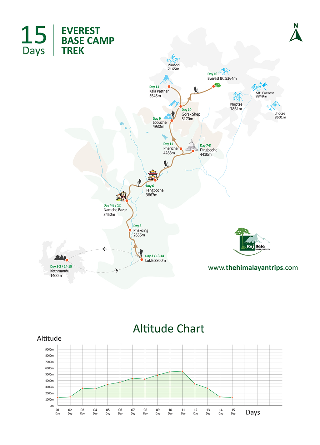 The 15-days Everest Base Camp Trek itinerary is designed for beginner trekkers who are in good health with average physical fitness. The ample distance covered between daily itineraries, steady gain of altitude and separate rest days ensures that we are properly acclimatized to fully enjoy our trek to the Everest base camp. Walking at high altitude trails with proper acclimatization and steady pace will help avoid getting the altitude sickness.