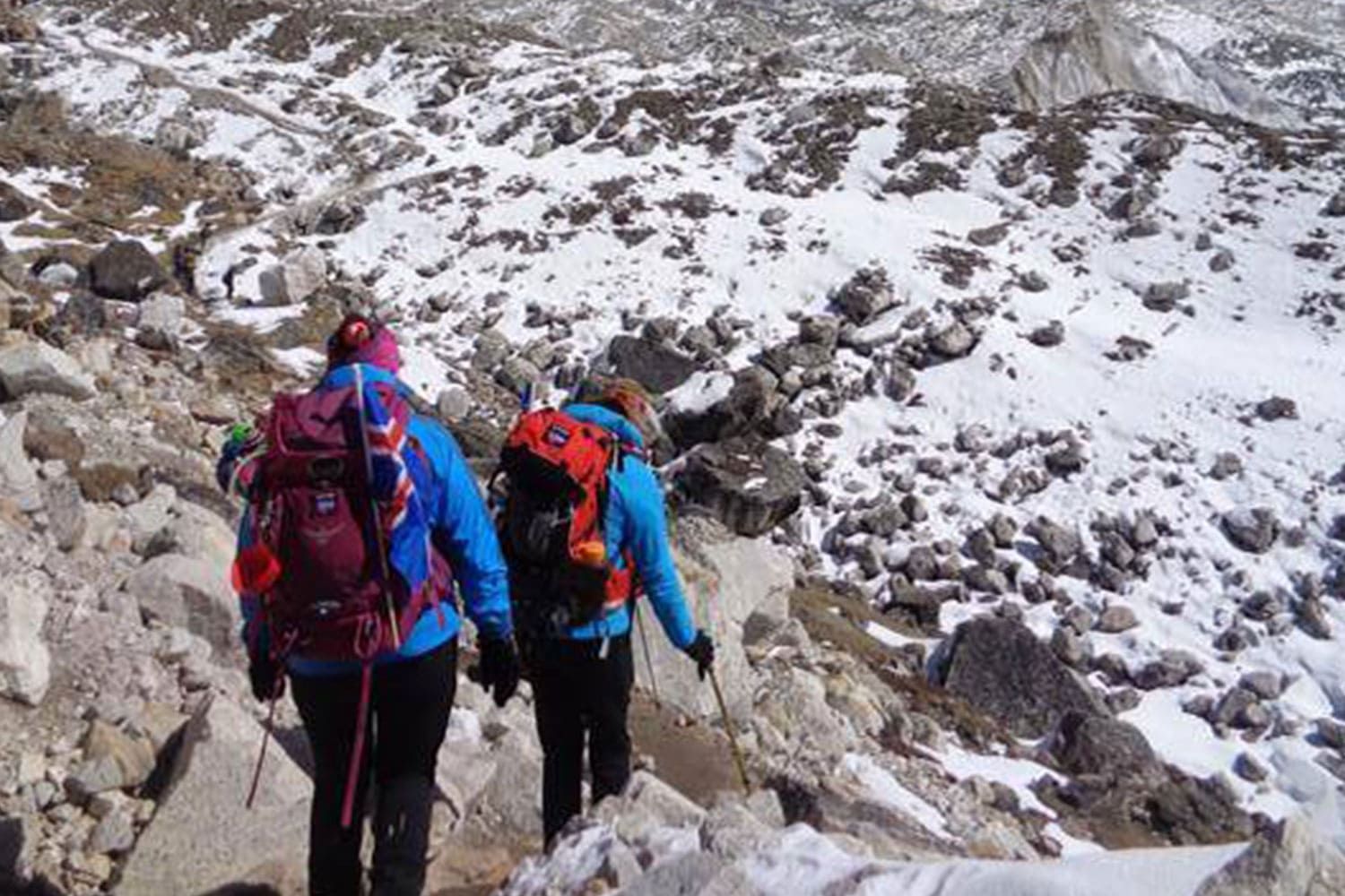 At Thangma Riju one can experience the 360 degree panaromic view snowcapped mountains. Actually Mount Everest is not seen from here however Mount Nuptse, Mount Nuptse and Mount Pumori can be viewed very well. Below Mount Pumori a grey grassy land of Kalopaththar can be seen after climbing up the steep through terrain of Changri glacier. Overnight in tea house. Meals included: Breakfast, lunch and dinner.